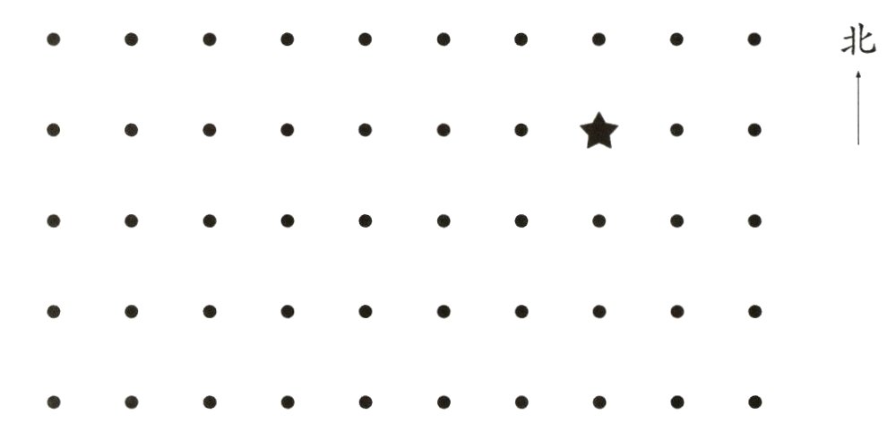 2. 李叔叔叫了一辆网约车。司机接到订单后先向北行驶了1站,又向东行驶了4站,然后向东北方向行驶了2站,就到了李叔叔的位置(★处),请圈出司机接单时的位置。(●表示站点)(6分)