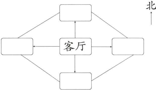 3. [新情境]在“我爱我家”班会上,笑笑积极发言:“我有一个温暖的家,家里有爱我的爸爸妈妈,我们常常在客厅里做游戏,客厅的南面是一个阳台,阳台的西北面是书房,书房的东北面是餐厅,餐厅的东南面是卧室……我爱我的爸爸妈妈,我爱我家”请你标出笑笑家各区域的位置。(4分)