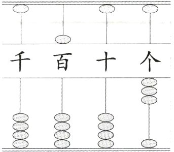 6. 小红在算盘上拨了4颗珠子(如图),百位上的1颗珠子表示( )个( ),个位上的3颗珠子表示( )个( )。
