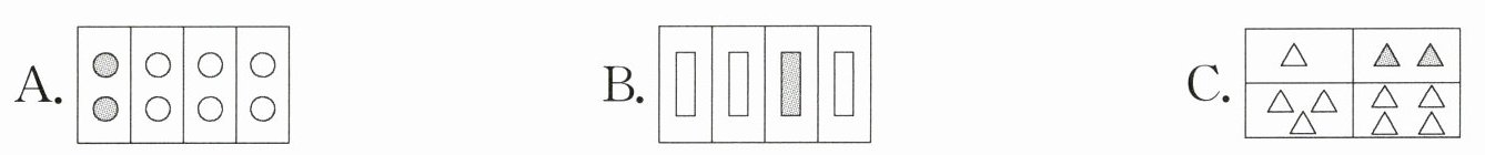 1. 下图中,阴影部分不能用$\frac{1}{4}$表示的是( )。