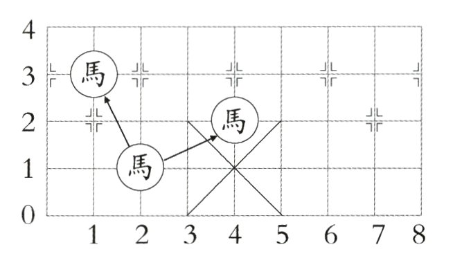 3. [新情境]中国象棋中“马”走的方向是沿着“日”字格走对角线,俗称“馬走日”。如图,“馬”原来的位置用数对表示是(____,____)。按图中箭头方向可以走到(____,____)或(____,____)。