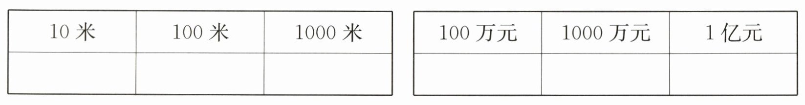 1.100张百元面值的人民币大约厚1厘米,合1万元。照这样推算,10000张百元面值的人民币大约厚1米,合100万元,那么1000000张百元面值的人民币大约厚多少米?合多少钱?(在合适的答案下面画“√”)(4分)