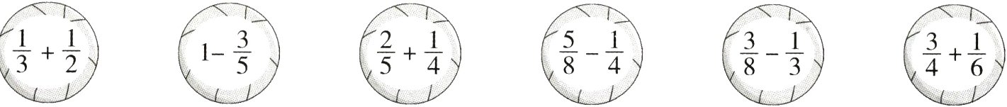 2.得数大于$\frac{1}{2}$:$\frac{1}{3}+\frac{1}{2}$ $\frac{2}{5}+\frac{1}{4}$ $\frac{3}{4}+\frac{1}{6}$;得数小于$\frac{1}{2}$:$1-\frac{3}{5}$ $\frac{5}{8}-\frac{1}{4}$ $\frac{3}{8}-\frac{1}{3}$