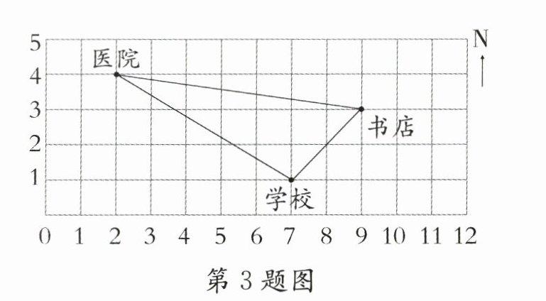 3. 如图,学校的位置用数对表示是( , ),数对(2,4)表示的是( )的位置。学校在数对(9,3)表示的场所的( )偏( )( )°方向。