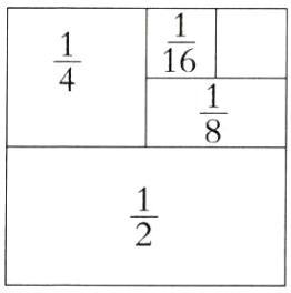 $\frac{1}{2}+\frac{1}{4}+\frac{1}{8}+\frac{1}{16} =$ $1-\frac{1}{2}-\frac{1}{4}-\frac{1}{8} =$
