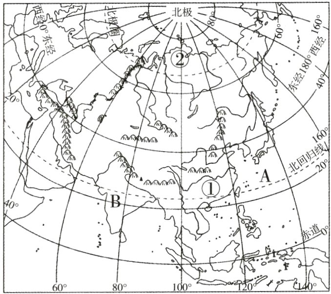 (4)亚洲地域广大,气候类型多样。导致①②两地气候差异的主要因素是 。