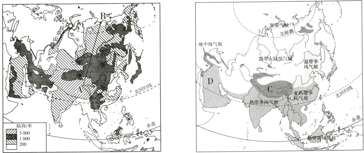 事例1:在亚洲气候类型分布图中,C地气温比D地低,其原因是 。