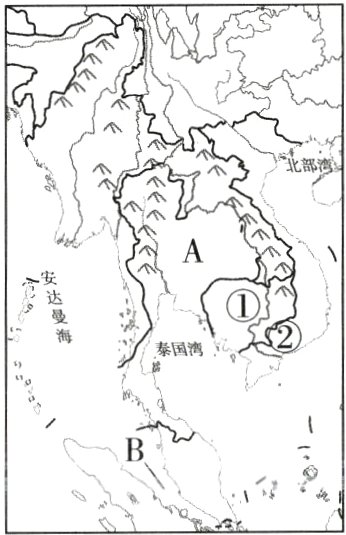 C [解析]读图可知,A为中南半岛。中南半岛上山河相间、纵列分布,地势北高南低,A项错误;大城市主要分布在大河沿岸及河口三角洲,不仅仅在①河流沿岸,B项错误;②位于河流下游,地势平坦,水流平缓,C项正确;中南半岛主要为热带季风气候,全年高温,分旱、雨两季,D项错误。故选C。