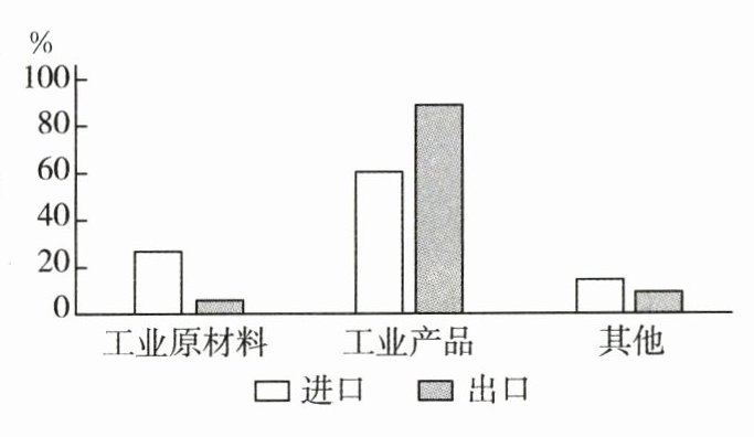 C [解析]读图可知,日本进口的工业产品多于工业原材料,A项错误;出口的工业产品多于工业原材料,B项错误;工业产品进口和出口量都最多,C项正确;日本的矿产资源尤其是能源矿产十分缺乏,需要进口,D项错误。故选C。