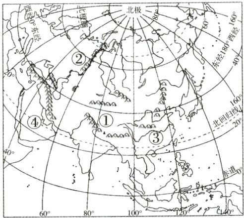 @@C [解析]亚洲地形以高原、山地为主,平均海拔高,地势起伏很大,高低悬殊。亚洲地势中部高、四周低,因此亚洲的大河多发源于中部的山地、高原,顺地势呈放射状流向周边的海洋。A、D两项错误。亚洲面积广大,季风气候显著,B项错误。④是阿拉伯半岛,是世界上最大的半岛,C项正确。