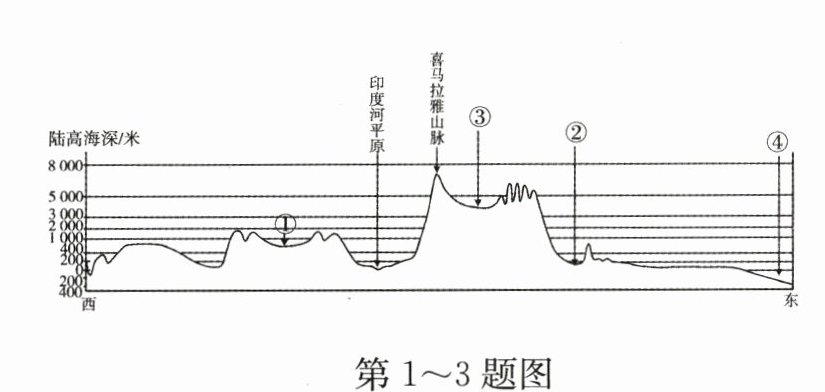 读亚洲大陆沿30°N纬线的地形剖面示意图,回答1~3题