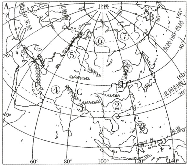 (2)亚洲地形多种多样,在各种地形中______是主体,约占四分之三。观察图中河流,其中亚洲第一长河是______(填序号和名称),亚洲河流分布呈______状向四周分流。