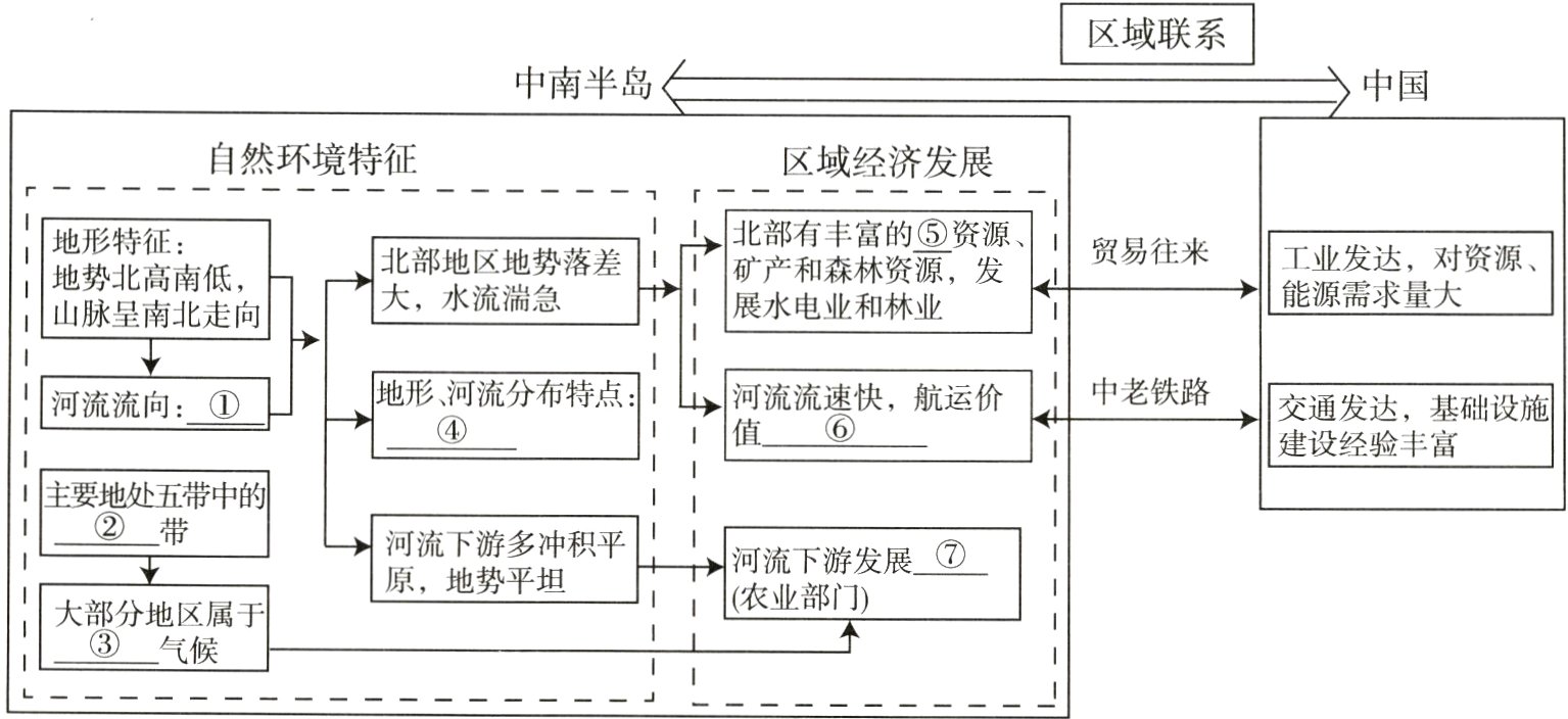 (2)中老铁路加强了中国与中南半岛间的区域联系。结合所学知识完成框图。