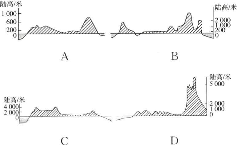 7. B [解析]读图可知,从M点向南经过斯堪的纳维亚山脉、平原、阿尔卑斯山脉和亚平宁半岛上的山脉到达N点。