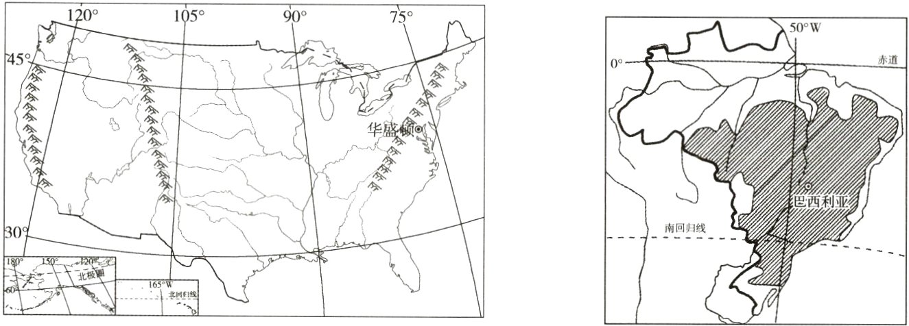 11. A [解析]美国本土和巴西均东临大西洋,A项正确;美国密西西比河自北向南注入墨西哥湾,B项错误;美国本土地势东西高,中部低,巴西地势南高北低(或:西北低,东南高),C项错误;美国本土绝大部分位于北温带,境内没有热带雨林分布,D项错误。故选A。12. B [解析]美国本土东北部五大湖地区经济发达,人口稠密,巴西东南部气候适宜,交通便利,人口和城市密集,A项错误;美国最大的城市为纽约,首都为华盛顿,巴西最大的城市为圣保罗,首都为巴西利亚,两国首都都不是本国最大城市,B项正确;美国属于发达国家,巴西属于发展中国家,C项错误;咖啡豆、可可属于热带农产品,美国主要位于北温带,不盛产热带农产品,D项错误。故选B。