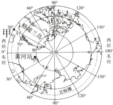 人类对极地地区的科学考察越来越频繁。读北极地区图,回答11~12题。
