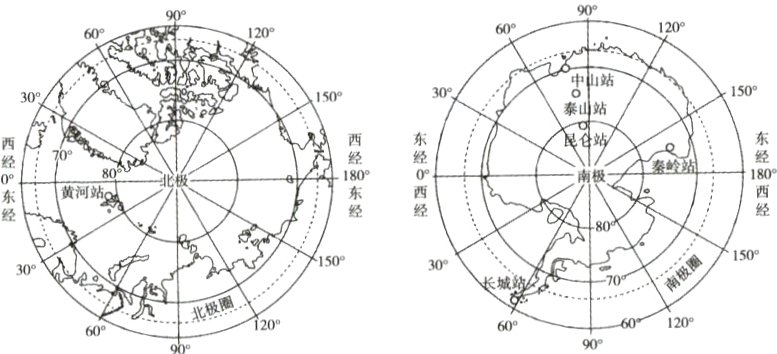 (苏州中考改编)2024年2月7日,中国第五个南极考察站——秦岭站正式开站,这是中国第三个南极常年考察站。南、北极地区是全球气候变化的敏感区域,近年来极地呈现快速增温趋势。读北极地区和南极地区示意图,回答13~15题。