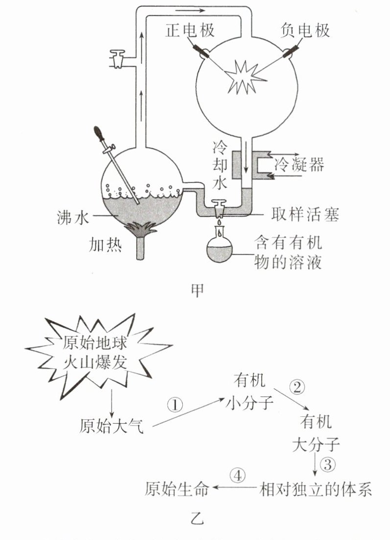 (1)图甲中,密闭的实验装置内循环流动的气体主要是水蒸气、氨气、氢气和甲烷等,模拟了原始地球的________成分,它与现在的大气成分相比,主要不含________。