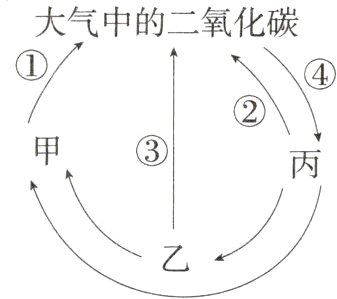 C 图中丙通过④吸收大气中的二氧化碳,丙为生产者,④表示光合作用;②把生产者体内的碳转变为二氧化碳,②表示呼吸作用;丙、乙都指向甲,甲是分解者,分解者通过①释放二氧化碳,①表示分解者的分解作用。方法技巧:物质循环中成分判断:与大气之间是双向箭头的成分是生产者,生产者和消费者都有箭头指向分解者。
