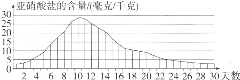 11.(主题教育·健康生活)(2023山东滨州中考,22,★☆☆)通过乳酸发酵制作的东北酸菜酸爽可口,深受人们喜爱。中华人民共和国国家卫生健康委员会发布的《食品中亚硝酸盐限量卫生标准》规定,亚硝酸盐在酱腌菜中的残留量不能超过20毫克/千克。在制作酸菜的一个月内,小明同学每天取样榨汁,测量其中亚硝酸盐含量并绘制成图。说法正确的是(B8271001)( )