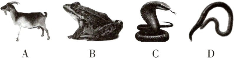 D A山羊、B青蛙、C蛇,它们都直接或间接以植物为食,属于消费者;D蚯蚓可通过分解枯枝落叶来获取有机物,属于分解者。