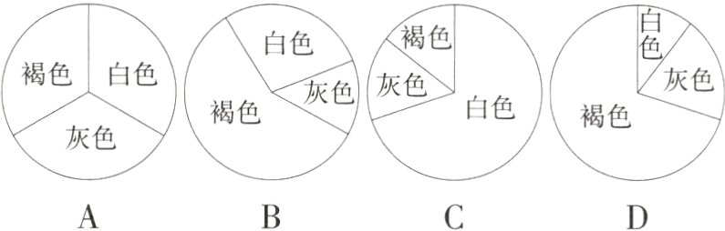 4. [跨数学·饼状图](2024重庆西南大学附中期中改编)在某森林中生活了一类蛾,有白、灰、褐三种体色,由于周围工厂煤烟排放导致树木的树皮多变为黑色,请你推测多年以后,最能体现各种蛾体色比例的图示是