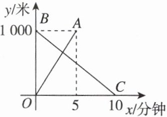 (2)由题图可知甲机器人的速度为$1000\div5 = 200$(米/分钟),乙机器人的速度为$1000\div10 = 100$(米/分钟),所以$\frac{1000}{100 + 200}=\frac{10}{3}$(分钟),所以出发后甲机器人行走$\frac{10}{3}$分钟,与乙机器人相遇。