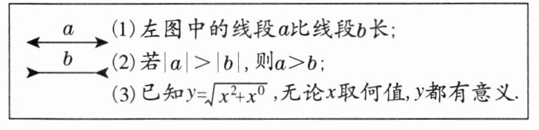 【解】小明的回答不正确,因为题图中线段a,b一样长;小颖的回答不正确,在(2)中,当a = -2,b = -1时,虽然|a| > |b|,但a < b;小贝的回答正确。