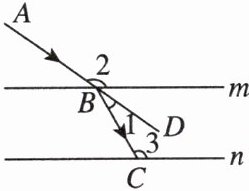 3. [2024·淄博高新区期中] 光从一种介质射向另一种介质时会发生折射,如图,用直线$m$,$n$表示一块玻璃的两个面,且$m// n$. 现有一束光线$AB$从空气射向玻璃,$BC$是折射光线,$D$为射线$AB$延长线上一点. 若$\angle 1 = 25^{\circ}$,$\angle 3 = 120^{\circ}$,则$\angle 2$的度数为( )