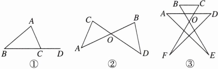 (2) 如图③,这是由线段组成的一个“风筝”形状,若∠BOF = 120°,运用(1)中得出的数量关系,求∠A + ∠B + ∠C + ∠D + ∠E + ∠F 的度数.