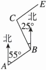 5. [2024·青岛李沧区期中] 如图,某生态园要修建一条灌溉水渠,水渠从$A$区沿北偏东$55^{\circ}$方向到$B$区,从$B$区沿北偏西$25^{\circ}$方向到$C$区,从$C$区到$E$区修建时,要想让水渠$CE$保持与$AB$方向一致,则$\angle ECB$的度数为 ( )