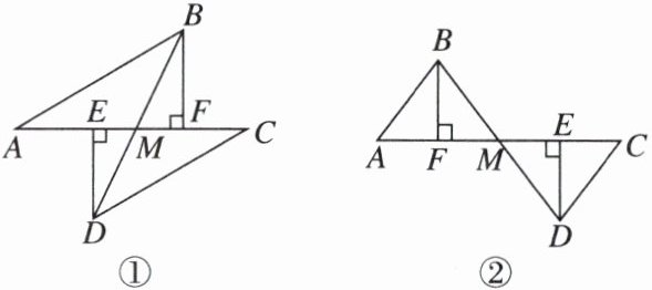 10. 如图①,$E$,$F$分别为线段$AC$上的两个动点,且$DE\perp AC$于$E$,$BF\perp AC$于$F$,若$AB = CD$,$AF = CE$,$BD$交$AC$于点$M$.