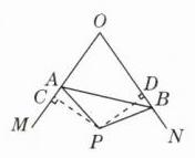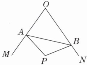 【证明】如图,过点 $P$ 分别作 $PC\perp OM$ 于点 $C$,$PD\perp ON$ 于点 $D$,则 $\angle PCO=\angle PDO=\angle PDB = 90^{\circ}$。 因为 $\angle PCO+\angle MON+\angle PDO+\angle CPD = 360^{\circ}$,$\angle MON = 70^{\circ}$,所以 $\angle CPD = 360^{\circ}-90^{\circ}-90^{\circ}-70^{\circ}=110^{\circ}$。 因为 $\angle APB = 110^{\circ}$,所以 $\angle CPD=\angle APB$,所以 $\angle CPD-\angle APD=\angle APB-\angle APD$,即 $\angle CPA=\angle DPB$。 在 $\triangle APC$ 和 $\triangle BPD$ 中,$\begin{cases}\angle PCA=\angle PDB\\\angle CPA=\angle DPB\\PA = PB\end{cases}$,所以 $\triangle APC\cong\triangle BPD(AAS)$,所以 $PC = PD$。 又因为 $PC\perp OM$,$PD\perp ON$,所以点 $P$ 在 $\angle MON$ 的平分线上。