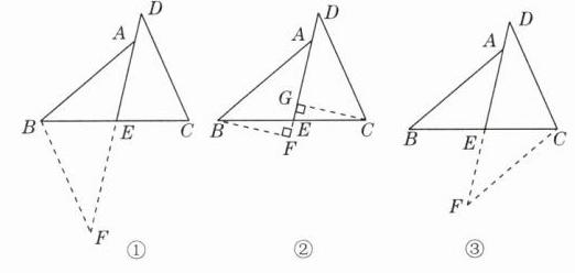 【证法一】如图①,延长 $DE$ 至点 $F$,使 $EF = DE$,连接 $BF$。因为 $E$ 是 $BC$ 的中点,所以 $BE = CE$。 又因为 $\angle BEF=\angle CED$,$EF = ED$,所以 $\triangle BEF\cong\triangle CED(SAS)$,所以 $BF = CD$,$\angle F=\angle D$。 又因为 $\angle BAE=\angle D$,所以 $\angle F=\angle BAE$,所以 $BF = AB$,所以 $AB = CD$。 【证法二】如图②,过点 $B$ 作 $BF\perp AE$,交 $AE$ 的延长线于点 $F$,过点 $C$ 作 $CG\perp AE$,交 $AE$ 于点 $G$,则 $\angle BFE=\angle CGE = 90^{\circ}$。 因为 $E$ 是 $BC$ 的中点,所以 $BE = CE$。 又因为 $\angle BEF=\angle CEG$,所以 $\triangle BEF\cong\triangle CEG(AAS)$,所以 $BF = CG$。 又因为 $\angle AFB=\angle DGC = 90^{\circ}$,$\angle BAF=\angle D$,所以 $\triangle ABF\cong\triangle DCG(AAS)$,所以 $AB = CD$。 【证法三】如图③,过点 $C$ 作 $CF// AB$,交 $DE$ 的延长线于点 $F$,则 $\angle BAE=\angle F$。因为 $E$ 是 $BC$ 的中点,所以 $BE = CE$。 又因为 $\angle BEA=\angle CEF$,所以 $\triangle BEA\cong\triangle CEF(AAS)$,所以 $AB = FC$。 因为 $\angle BAE=\angle D$,$\angle BAE=\angle F$,所以 $\angle F=\angle D$,所以 $FC = CD$,所以 $AB = CD$。