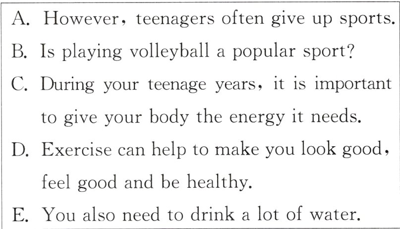 3. ________ Scientists suggest(建议)that teenagers spend at least 30 minutes exercising,five times a week. That is easy to do! You can walk or ride your bike to school,and do sports at school. 4. ________ They say they have no time left after their studies. In fact,doing exercise can help them sleep better at night and increase their ability to focus on their study.