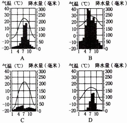 解析:本题考查北京的气候特点。北京属温带大陆性季风气候,冬季寒冷干燥、夏季高温多雨,图中仅A图符合。B图为热带季风气候,C图为温带大陆性气候,D图为高原山地气候。