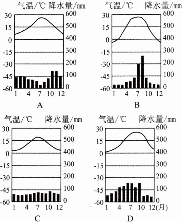 (3)下列四幅图中,表示北京气候特征的图是( )