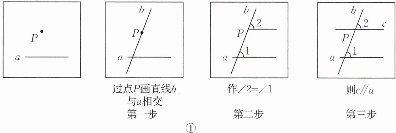 甲同学用的是尺规作图(P是直线a外一点,过点P作c//a).具体作图步骤如图2-2-7①所示.