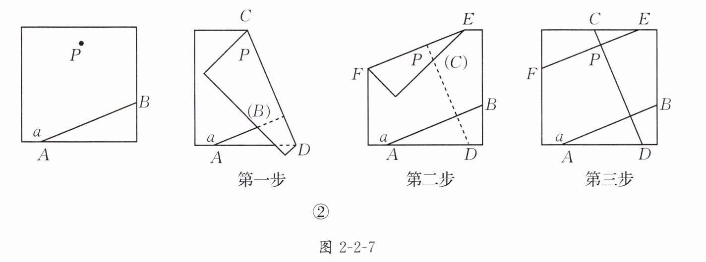 乙同学用的是折纸的方法(P是直线a外一点,直线a与正方形纸的相邻两边分别相交于A,B,过点P折出EF//a).具体折纸步骤如图2-2-7②所示.