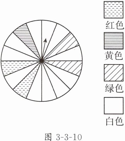 1. 某商场柜台为了吸引顾客,打出了一个小广告如下:本专柜为了感谢广大消费者的支持和厚爱,特举行购物抽奖活动,中奖率为100%,最高奖为50元的购物券.具体方法是:顾客每购买100元的商品,就能获得一次转动转盘(转盘的各个区域均被等分)的机会(如图3-3-10),如果转盘停止后,指针正好对准黄、红、绿、白色区域,顾客就可以分别获得50元、20元、10元、5元的购物券.请根据以上信息,解答下列问题: