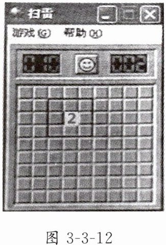 3. 图3-3-12是计算机“扫雷”游戏的画面,在9×9个小方格的“雷区”中,随机埋藏着10颗“地雷”,每个小方格最多能埋藏1颗“地雷”. 小明游戏时先踩中一个小方格,显示数字2,它表示与这个方格相邻的8个小方格(图中黑框所围区域,设为A区域)中埋藏着2颗“地雷”.
