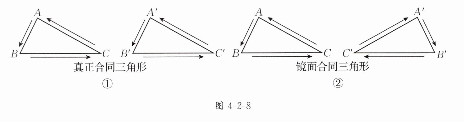 3. 全等三角形也叫合同三角形,平面内的合同三角形分为真正合同三角形和镜面合同三角形. 假如△ABC和△A'B'C'是全等三角形,且点A与点A'对应,点B与点B'对应,点C与点C'对应. 如图4-2-8①②,当沿周界A→B→C→A及A'→B'→C'→A'环绕时,若运动方向相同,则称它们是真正合同三角形;若运动方向相反,则称它们是镜面合同三角形.