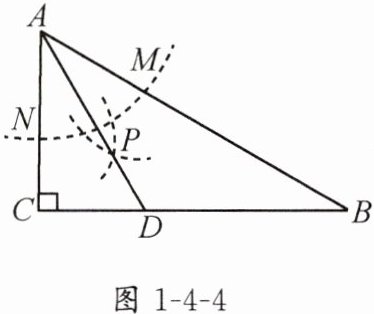 5. 如图1-4-4,在△ABC中,∠C = 90°,∠B = 30°,以A为圆心,任意长为半径画弧分别交AB于点M,AC于点N,再分别以点M,N为圆心,大于$\frac{1}{2}MN$的长为半径画弧,两弧交于点P,连接AP并延长交BC于点D,下列四个结论:①AD是∠BAC的平分线;②∠ADC = 60°;③点D在AB的垂直平分线上;④$S_{△ACD}$:$S_{△ACB}$= 1:3. 其中正确的有_______.(填序号)
