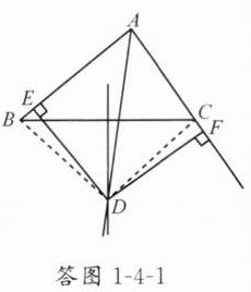 证明:如答图1 - 4 - 1,连接BD,CD,根据垂直平分线性质可得BD = CD. 因为D为∠BAC平分线上的点,DE⊥AB,DF⊥AC, 所以DE = DF. 在Rt△BDE和Rt△CDF中, {DE = DF, BD = CD, 所以Rt△BDE≌Rt△CDF(HL), 所以BE = CF.