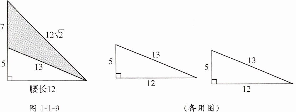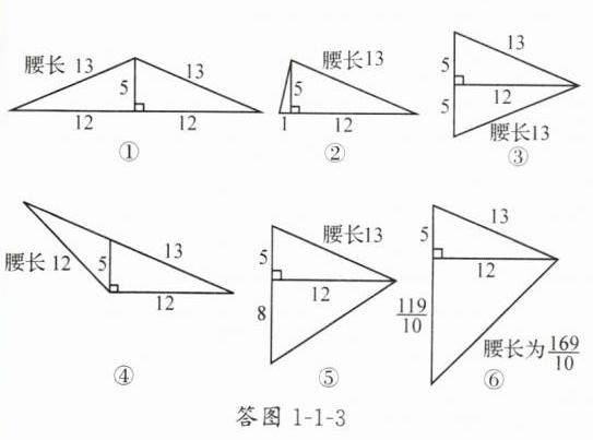 (2)将一个边长分别为5,12,13的直角三角形拼上一个三角形后可以拼成一个等腰三角形,图1-1-9就是其中的一种拼法,请你画出其他所有可能的情形,并在图上标出所拼成等腰三角形的腰的长度.(选用备用图画图,每种情形用一个图形单独表示,并用①②③…编号,若备用图不够,请自己画图补充)