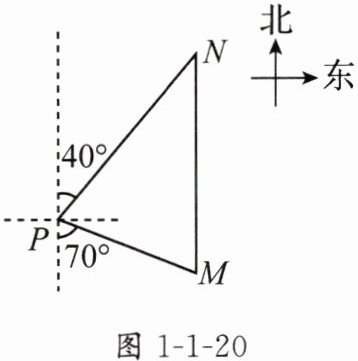 3. 如图1-1-20,一艘海轮位于灯塔$P$南偏东$70^{\circ}$方向的$M$处,它以每时$40\ n\ mile$的速度向正北方向航行,$2$小时后到达位于灯塔$P$北偏东$40^{\circ}$的$N$处,则$N$处与灯塔$P$的距离为______$n\ mile$.