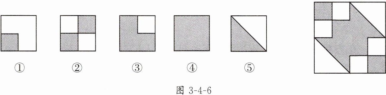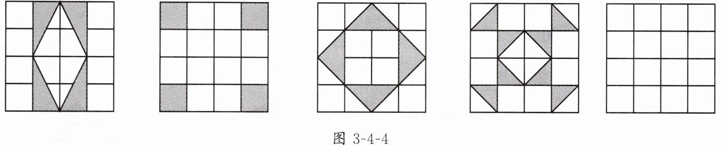 5. 认真观察图3-4-4中的前4个图中阴影部分构成的图案,请在下面最后一个图中设计出你心中最美丽的图案,使它也具备前述四个图中的至少两个图案所具有的共同特征.