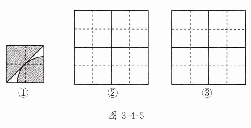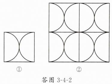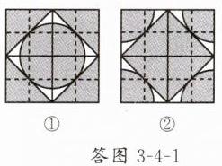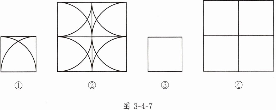 2. 实践与操作:图3-4-7①是以正方形两顶点为圆心,边长为半径,画两段相等的圆弧而成的轴对称图形,图3-4-7②是以图3-4-7①为基本图案经过图形变换拼成的一个中心对称图形.