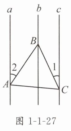 1. 如图1-1-27,直线a//b//c,等边三角形ABC的顶点A,B,C分别在直线a,b,c上,边BC与直线c所夹的∠1 = 25°,则∠2的度数为( ).
