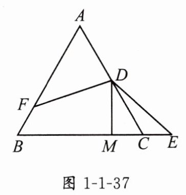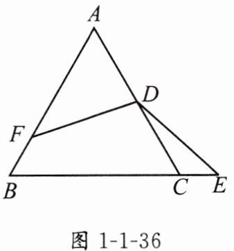 3. 如图1-1-36,在等边三角形ABC中,D为AC的中点,E为BC延长线上一点,∠EDF = 120°,DF交AB于点F,且AF = nBF(n为常数,且n>1).